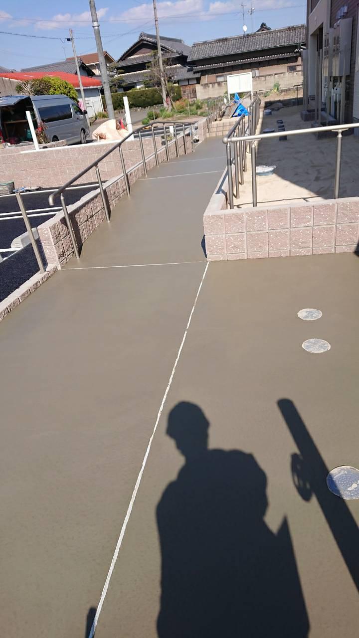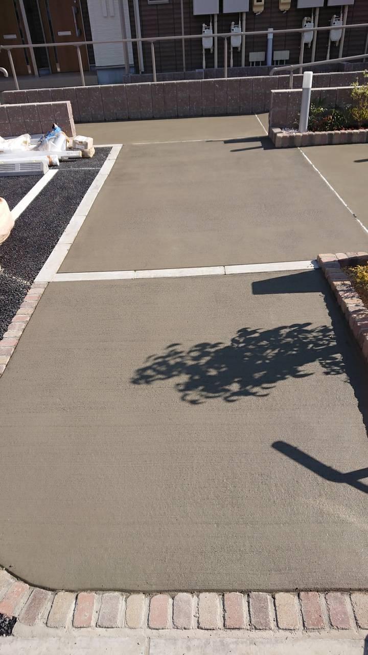 今日の作業現場。北区アパート外構コンクリート工事、武豊ドラックストア左官工事。